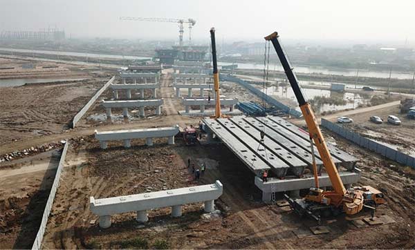 市重點(diǎn)工程濱響大道項(xiàng)目新進(jìn)展!疏港航道大橋首跨預(yù)制箱梁架設(shè)完成